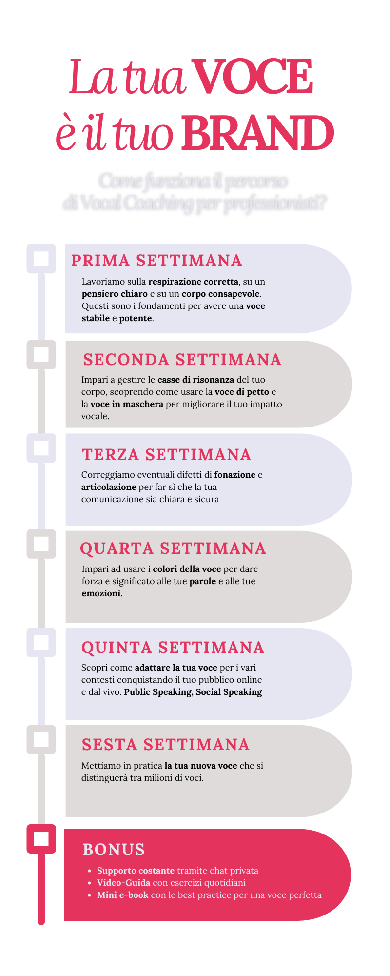 Se invece pensi di avere la giusta motivazione per fare un piccolo passo alla volta e rivoluzionare la percezione che le persone hanno di te grazie al potere ancora inesplorato della tua voce, continua a leggere i benefici di un percorso.